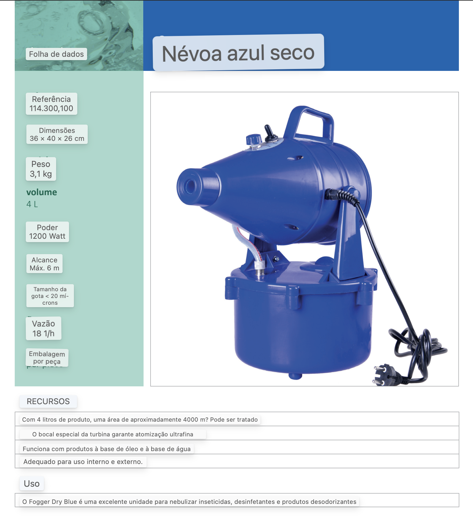 O Fogger Dry Blue é uma excelente unidade para nebulizar inseticidas, desinfetantes e produtos desodorizantes